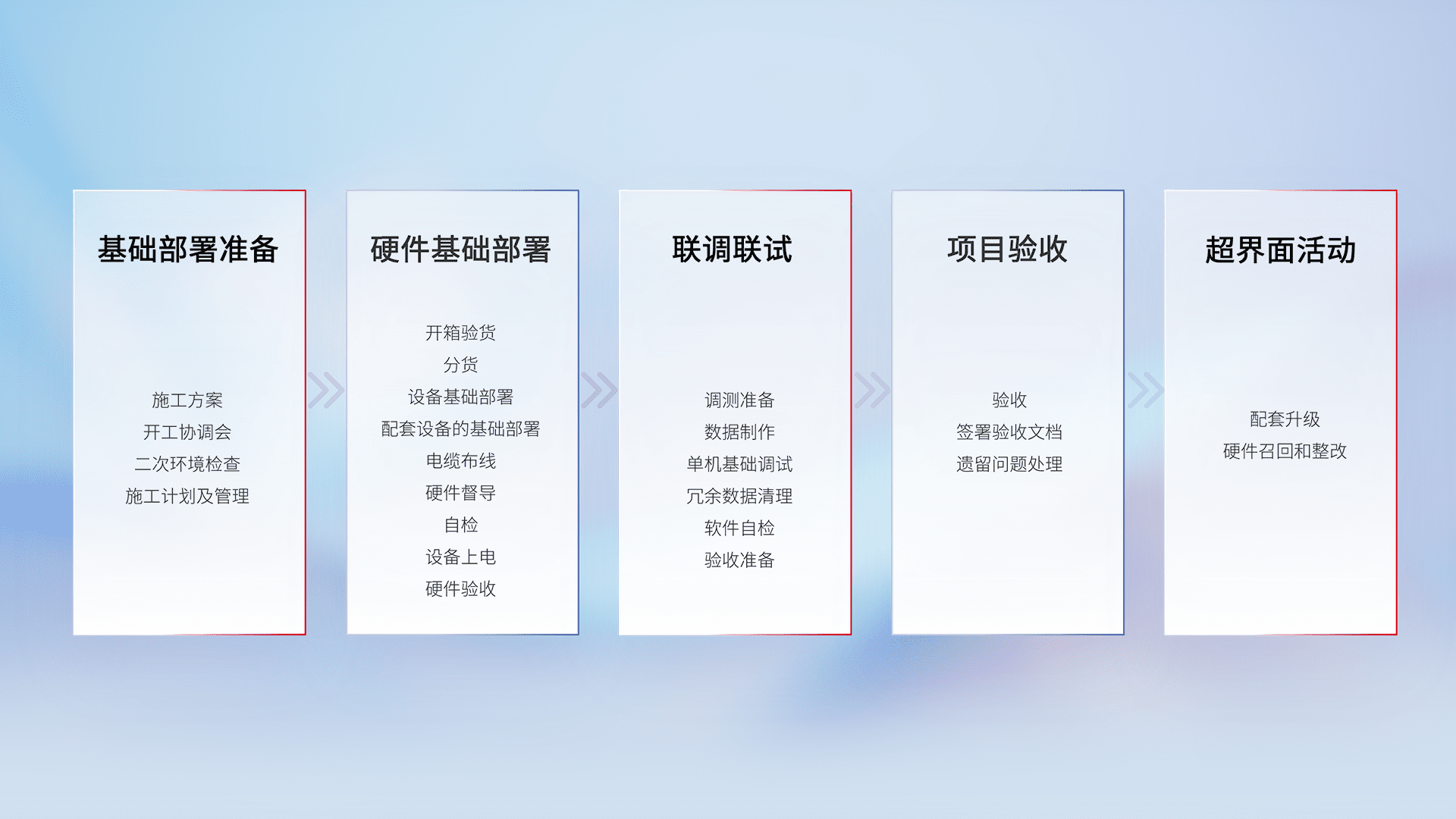 从基础部署准备、、硬件基础部署、、、联调联试、、、、项目验收、、越界面活动的全过程可追溯,,,,保证施工质量和进度。。
